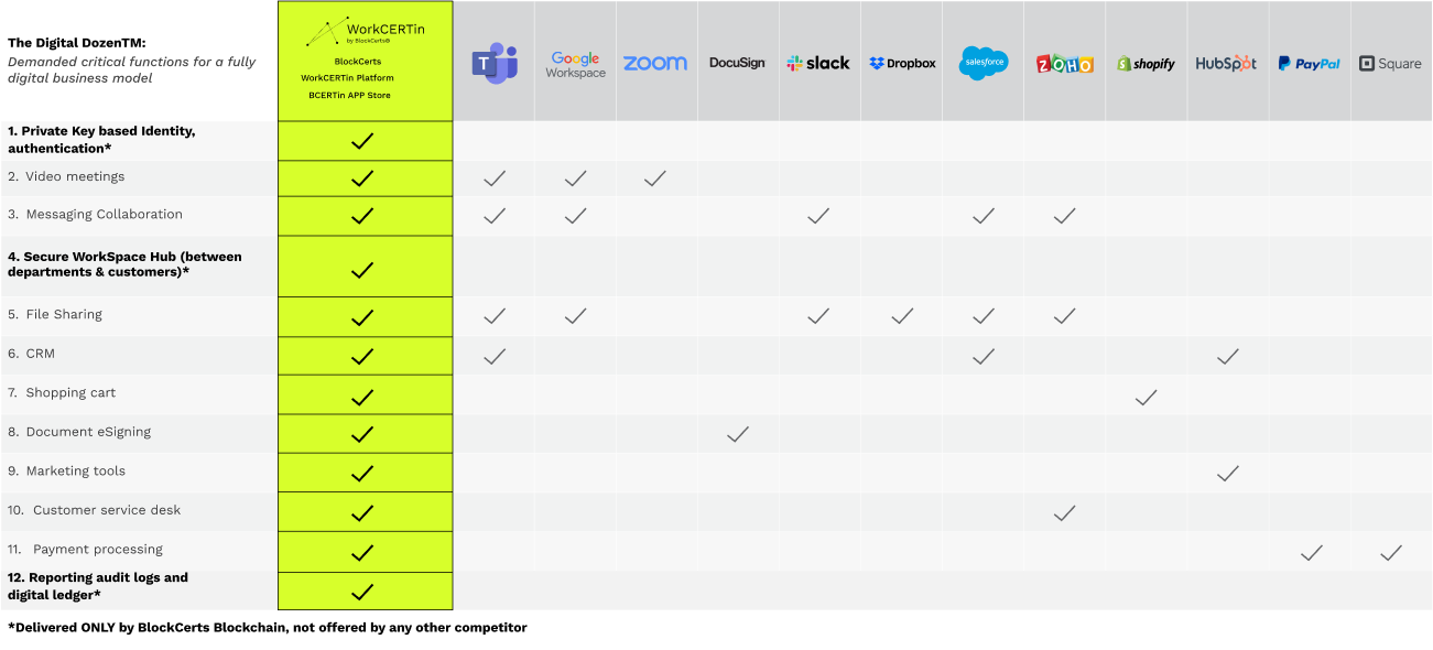 • BlockCerts Blockchain is a minerless private blockchain (reducing the carbon footprint), with open-source API’s and blockchain agnostic cross-chains.